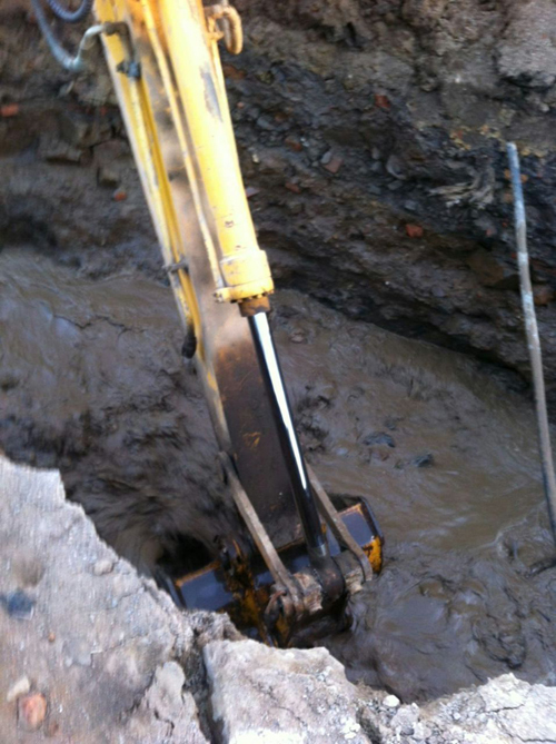 2015年4月16日下午4:30分,二分公司供水維修隊接到報修電話,岔溝施工隊負(fù)責(zé)人稱他們在建設(shè)位于市政府后身的岔溝回遷樓過程中,因鉤機(jī)作業(yè)時挖壞了供水主管道,造成大量自來水外流?,F(xiàn)場破壞面積過大,已造成周邊水流大量淤積。接到電話后,公司分管營業(yè)的副經(jīng)理馬旭和營業(yè)二分公司經(jīng)理張志明立即帶領(lǐng)維修隊人員在20分鐘內(nèi)趕到現(xiàn)場,在進(jìn)行勘察的同時,搶修物質(zhì)運達(dá)維修現(xiàn)場,一場供水管線搶修工作緊張而有序地展開。