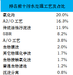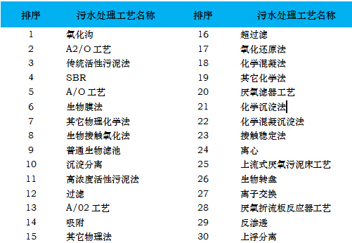 據(jù)不完全統(tǒng)計(jì),全國范圍內(nèi)已建成運(yùn)營的污水處理廠數(shù)量約4000座,這其中有統(tǒng)計(jì)數(shù)據(jù)的污水處理工藝大約30種左右,E20研究院統(tǒng)計(jì)各類技術(shù)工藝,排名如下文所示: