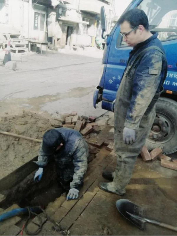 正月初二9:30,營業(yè)第二分公司接到用戶報修電話,反映教育園區(qū)B區(qū)73號樓前供水管線漏水。值班維修人員高峰、張良、張少輝第一時間趕赴現(xiàn)場,當(dāng)即投入到緊張的搶修當(dāng)中。尋找漏點需要破除冰層、挖掘凍土。為了搶時間,他們用鐵鎬、鐵鍬手工輔助除冰、破土。在室外溫度-15℃的工作環(huán)境下,經(jīng)過兩個小時的挖掘,終于找到漏點,順利完成維修。
